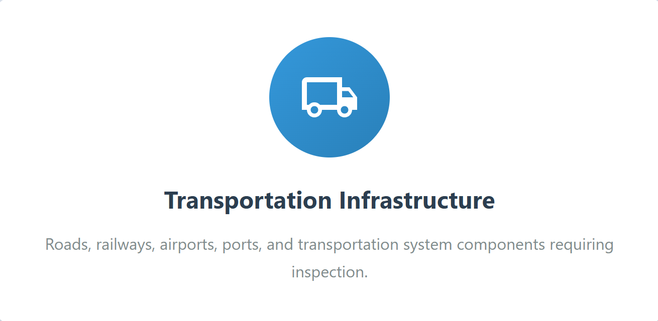 Highways, railways, airports, and port facilities depend on structural reliability for safe, efficient operations. We conduct thorough inspections of transportation assets including runway surfaces, rail infrastructure, and cargo handling equipment, ensuring compliance with safety standards while minimizing service interruptions.